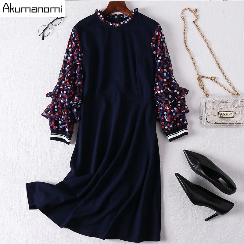 Autumn Spring Dress Women Plus Size 5xl Ruffled Lace Long Sleeve Blue Casual Party Office Elegant D