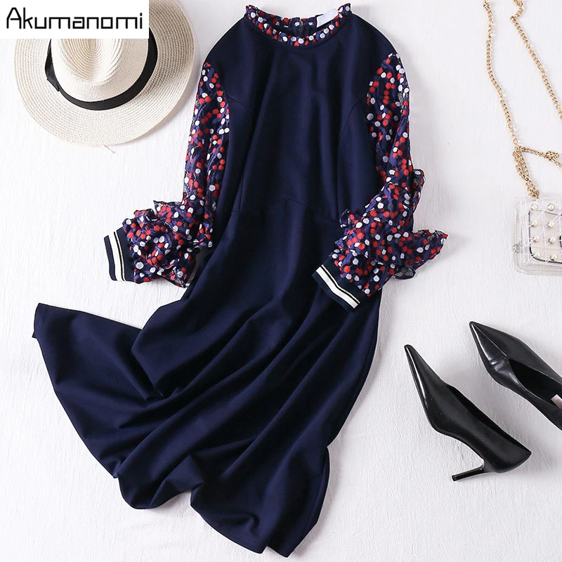 Best Seller Autumn Spring Dress Women Plus Size 5xl Ruffled Lace Long Sleeve Blue Casual Party Office Elegant D